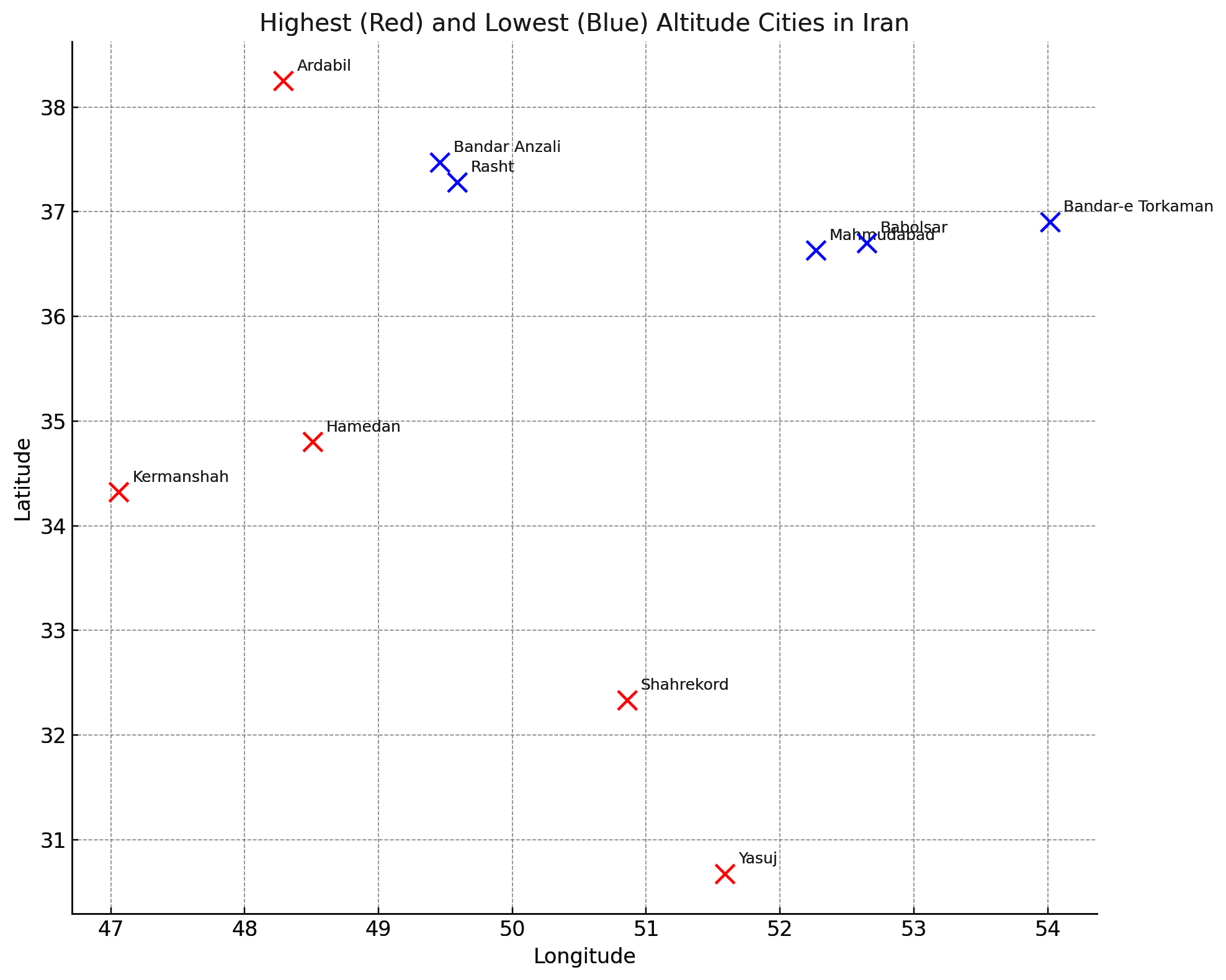 نمودار زیر مکان نسبی قرار گرفتن مرتفعترین و کمارتفاعترین شهرهای ایران را نشان میدهد. گفتنی است ارتفاع سطح دریای خزر نسبت به آبهای آزاد -۲۶ (پایینتر از سطح) است.