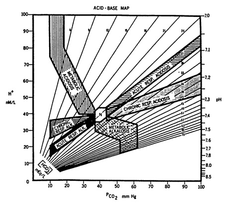 در سال ۱۹۷۳، گلدبرگ و همکارانش بر اساس معادله هندرسون هاسلباخ برای گازهای خون، یک نقشه اسید-باز ایجاد کردند که سطوح مورد انتظار pH خون شریانی، [HCO32] و PCO2 را در اختلالات مختلف اسید-باز ترسیم میکرد. این نقشه در واقع نموداری از PCO₂– [HCO₃–] (یا PCO₂–pH) بود متشکل از خطوط بیتفاوتی و نوارهای اطمینان که به طبقهبندی اختلالات تنفسی یا متابولیک حاد یا مزمن و همچنین تشخیص اختلالات ترکیبی برای کاربران دستگاههای گازهای خونی کمک میکند.